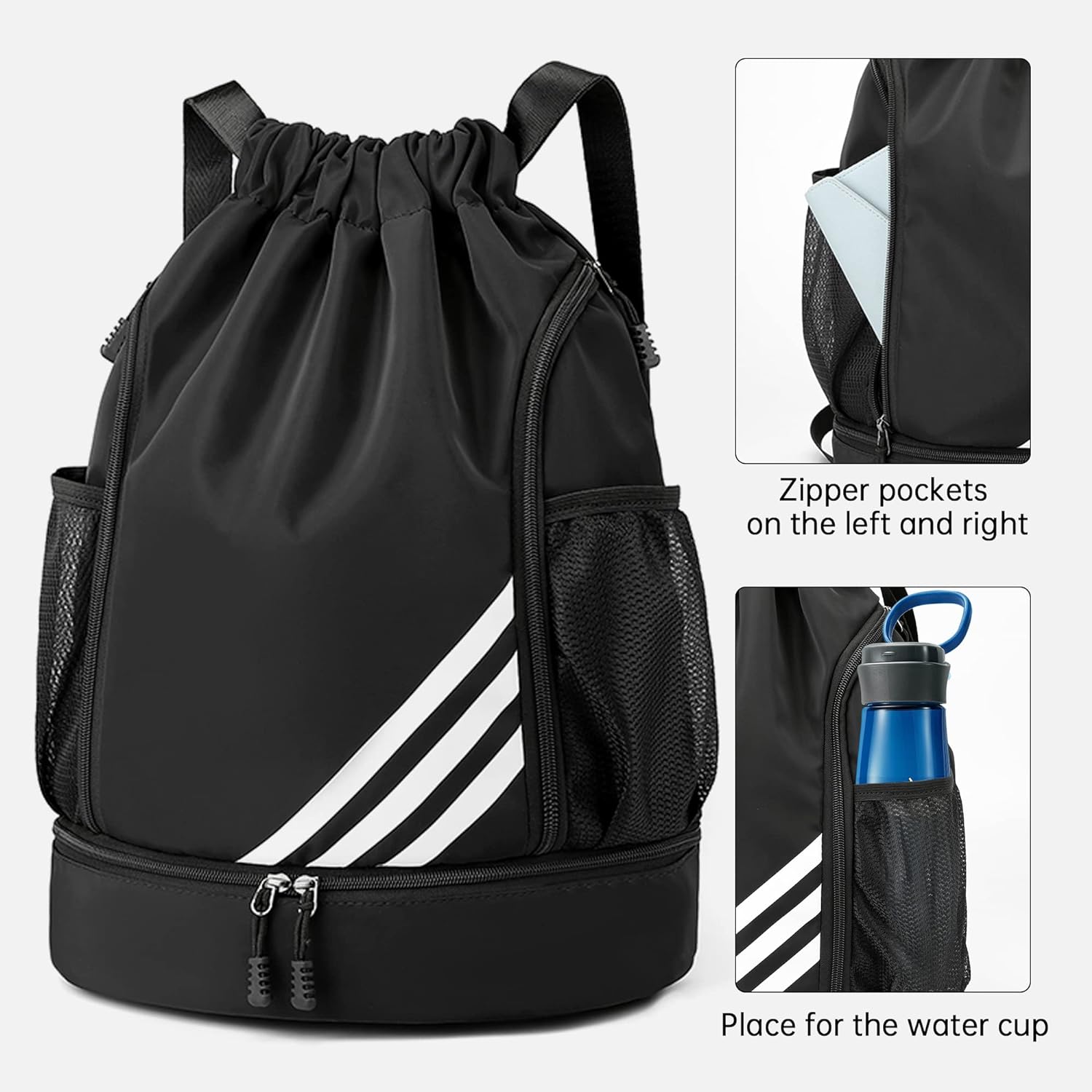 Dizajn s više džepova: bočni džepovi s elastičnim trakama na obje strane ruksaka s uzicom mogu držati boce s vodom, kišobrane; prednji džep može pohraniti maramice i toaletne potrepštine.